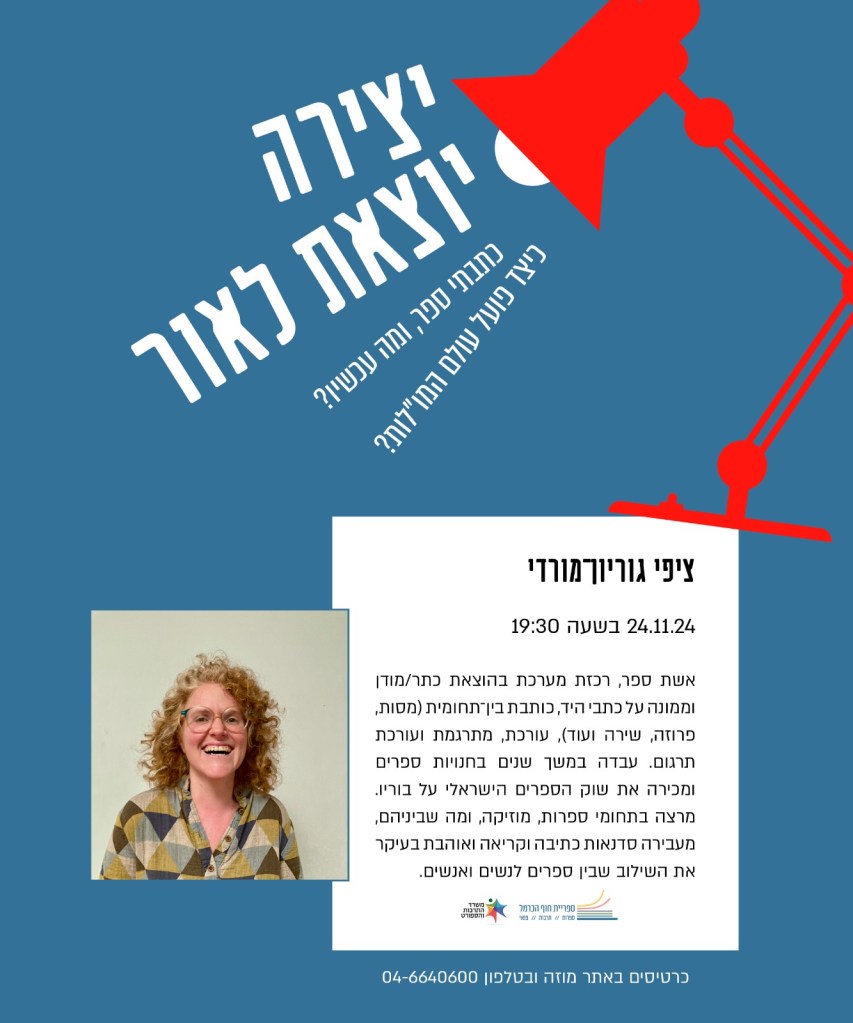 הערב אדבר בספריית חוף הכרמל על שוק הספרים ועל מה קורה היום בחנויות, מה כדאי לעשות עם כתב יד ומה למען השם יהיה (סתם, לא יודעת מה יהיה, אבל אני יכולה לתת לכן את הסיפא: תמיד אמרו ששוק הספרים במצב מחורבן והוא באמת תמיד במצב מחורבן אבל כנראה תמיד נרצה לכתוב ותמיד נרצה לקרוא אז נו).